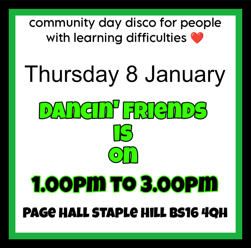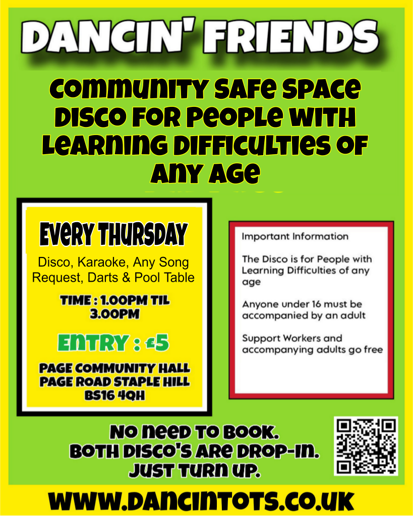 DANCIN' FRIENDS COMMUNITY SAFE SPACE DISCO FOR PEOPLE WITH LEARNING DIFFICULTIES OF ANY AGE EVERY